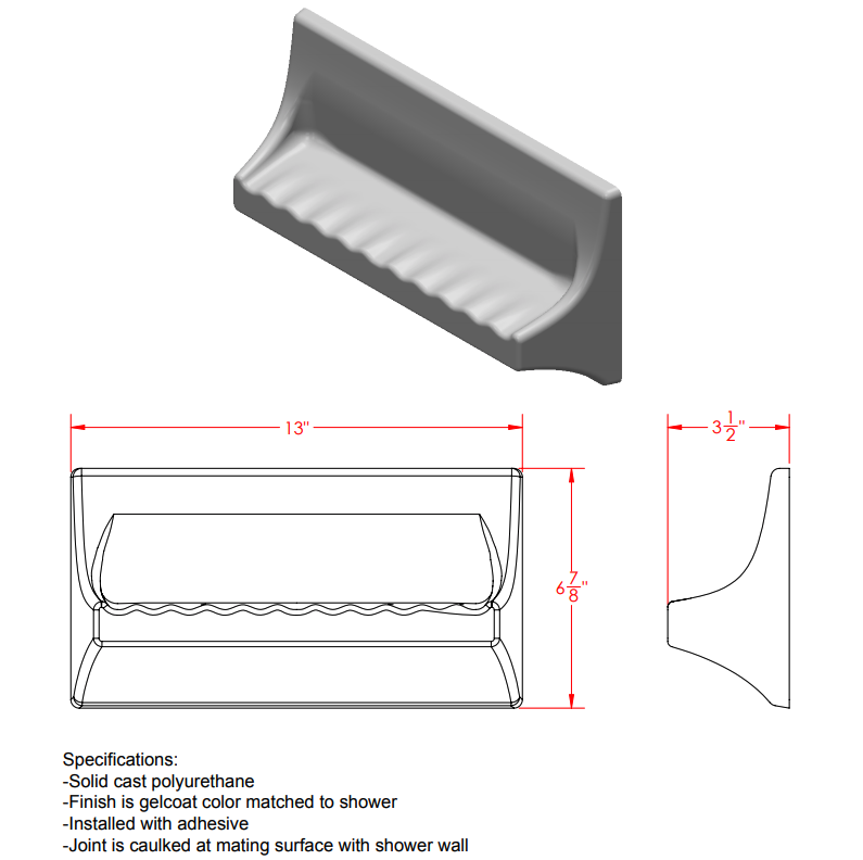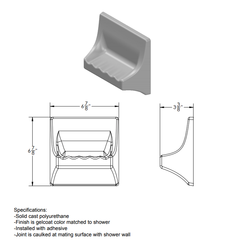 This surface-mount soap dish is a solid cast polyurethane with a smooth, durable gelcoat finish,color-matched to your Bestbath unit. Fast and easy installation with adhesive and 100% silicone to create a seamless appearance.